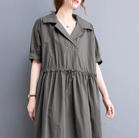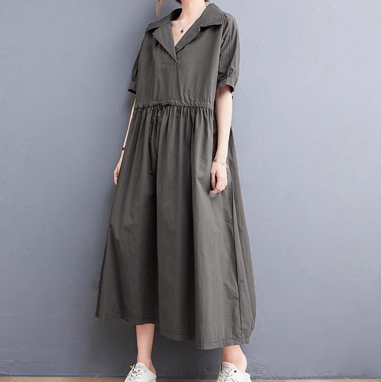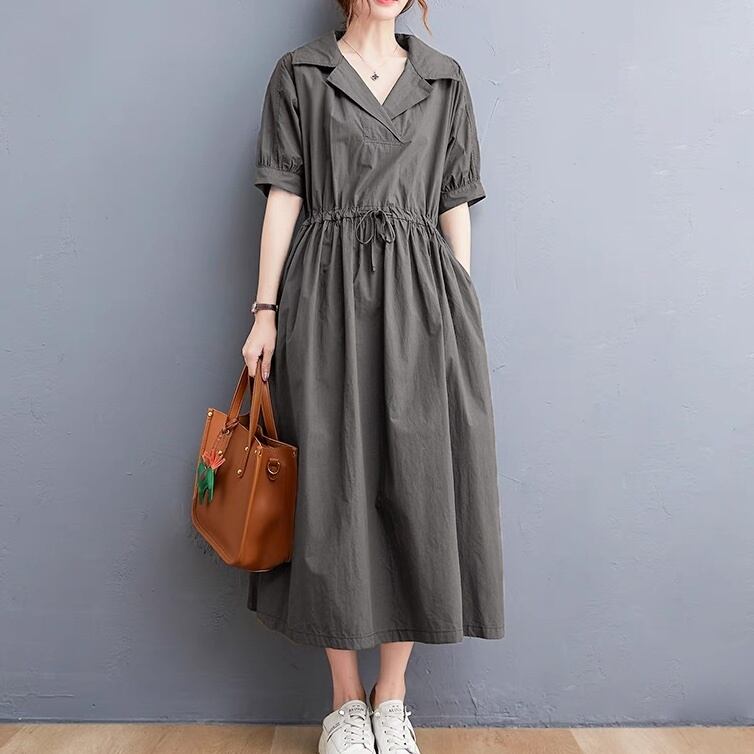 レディース ワンピース シャツワンピ フレア 膝下 半袖 5分袖 Vネック 襟付き 角襟 Aライン オーバーサイズ フェミニン ストリート ウエストマーク ウエストリボン ポケット ハイウエスト ドロスト 薄手 かわいい 大人可愛い きれいめ シンプル カジュアル おしゃれ レトロ プレッピー カントリー アクティブ ナチュラル ファッショナブル 無地 お出かけ 休日 楽ちん 体型カバー 普段使い 着回し トレンド 流行 インスタ映え L XL 大きいサイズ ビッグ ゆったり ゆる 黒 ブラック カーキ