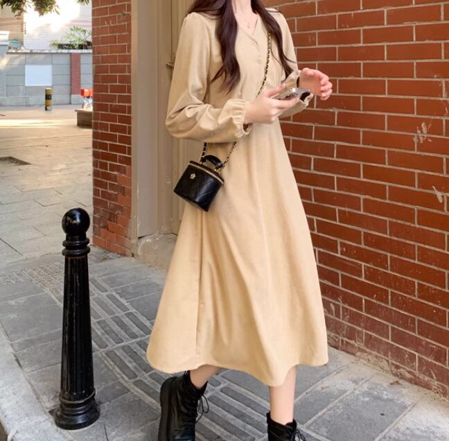 レディース ワンピース フレアワンピース ミモレ丈 長袖 パフスリーブ 袖あり Vネック 襟なし フレア ハイウエスト ボタン かわいい 大人可愛い シンプル カジュアル おしゃれ レトロ キュート 無地 秋 冬 10代 20代 ティーン お嬢さん デート お出かけ イベント 旅行 レストラン 公園 女子会 休日 ショッピング 合コン コンパ カフェ 楽ちん 美脚 脚長 普段使い モテ 清楚 S M L カラバリ 黒 ブラック ベージュ 大人カラー 秋カラー