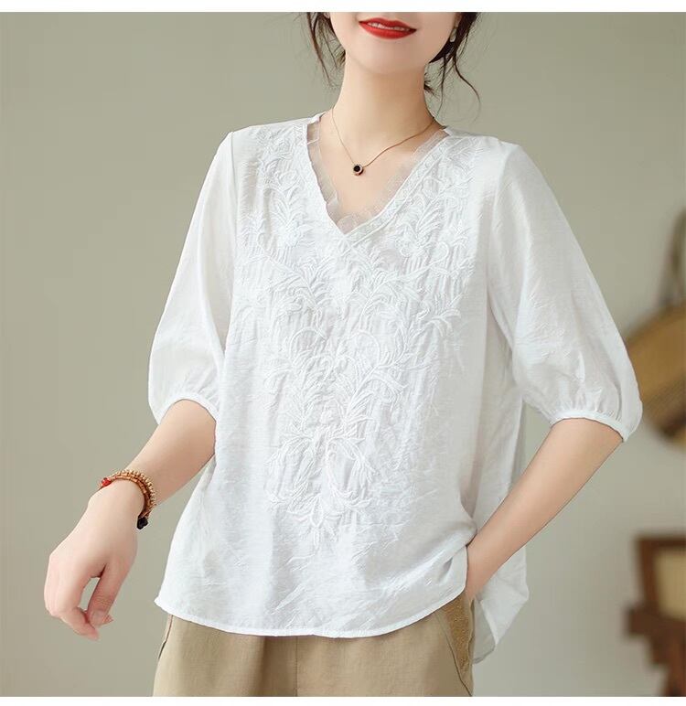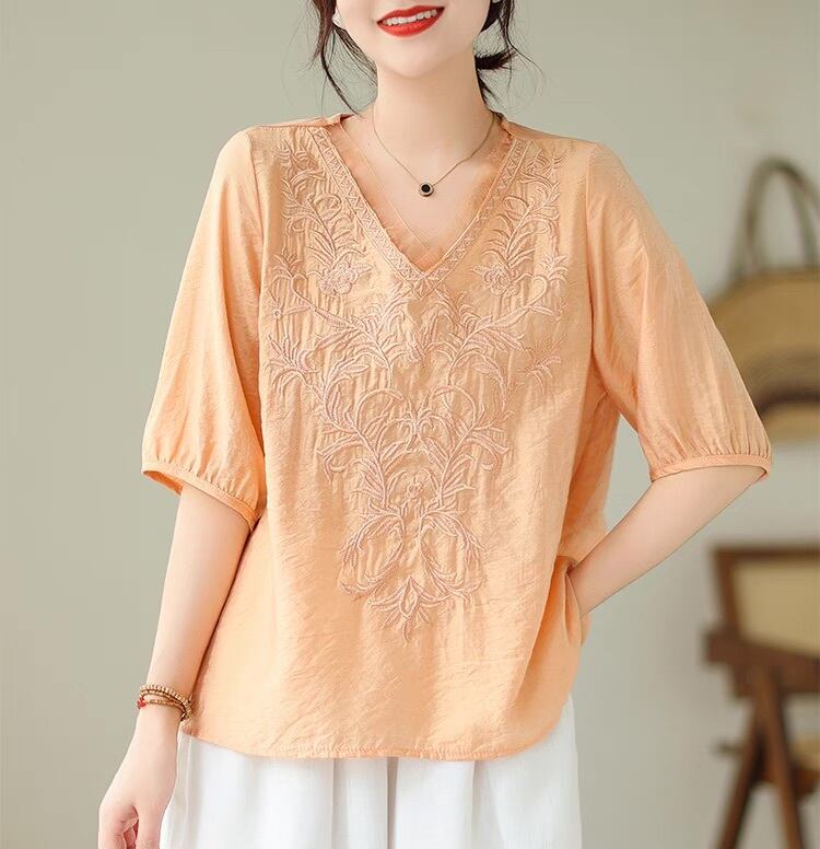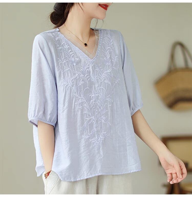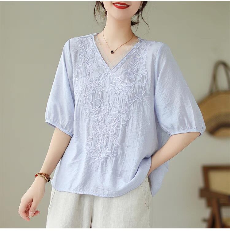 レディース シャツ ブラウス カットソー 5分袖 フェミニン 刺繍 フリル かわいい 大人可愛い カジュアル おしゃれ レトロ アジアン エスニック エキゾチック こなれ感 抜け感 ヴィンテージ ラブリー キュート ロマンティック ナチュラル ファッショナブル デート 旅行 休日 韓国 オルチャン 体型カバー 普段使い 着回し トレンド 流行 インスタ映え M L XL 2XL 3XL 大きいサイズ ビッグ ゆったり ゆる 白 ホワイト 紫 黄色 イエロー ピンク オレンジ レッド ネイビー 緑 グリーン