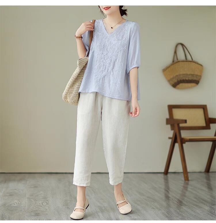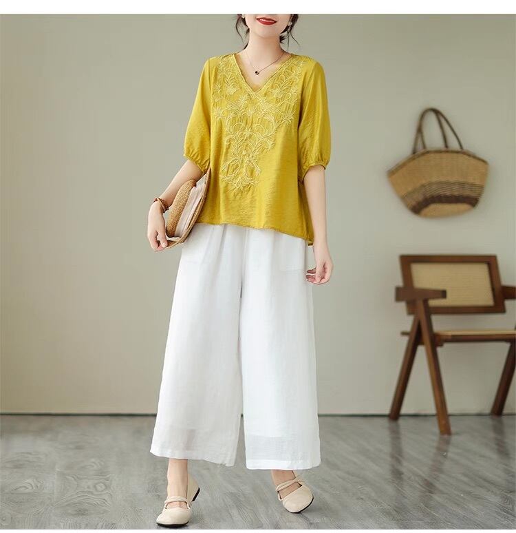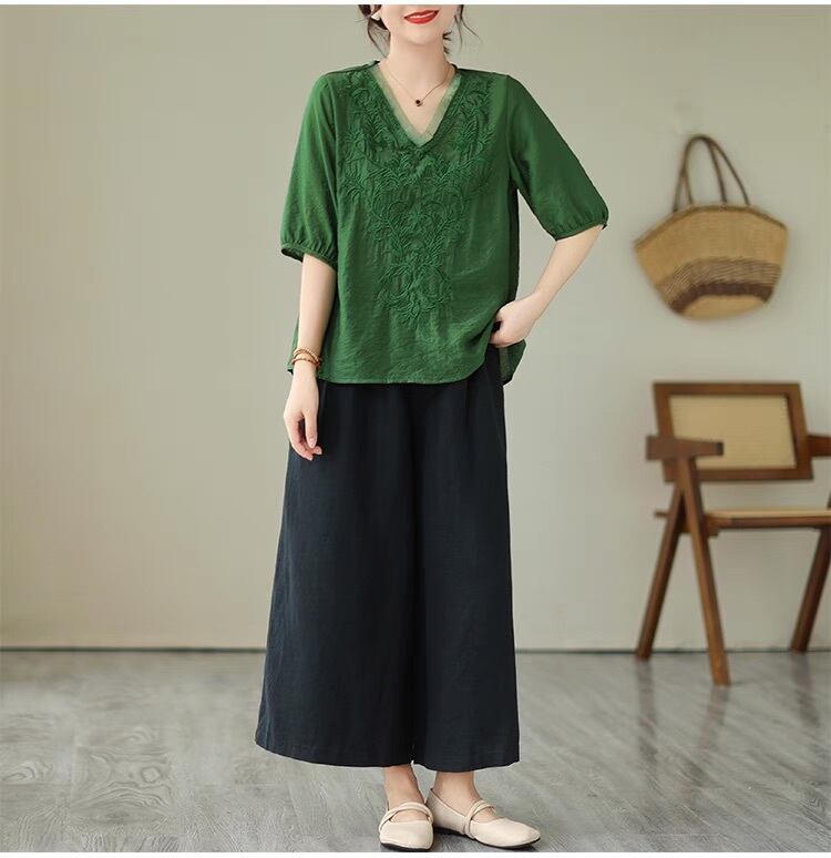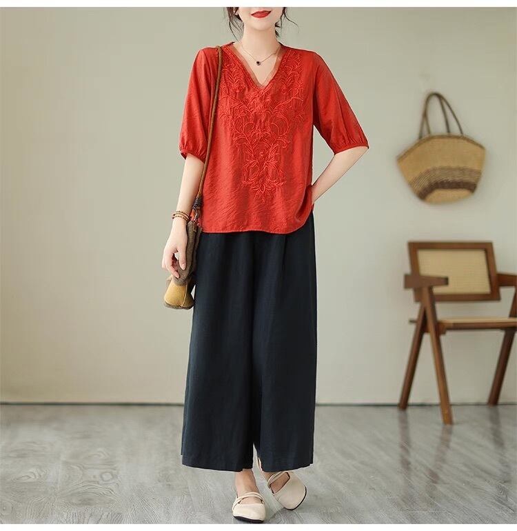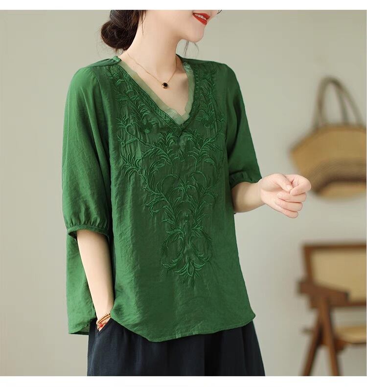 エスニック刺繍が光る!フェミニン5分袖ブラウス。