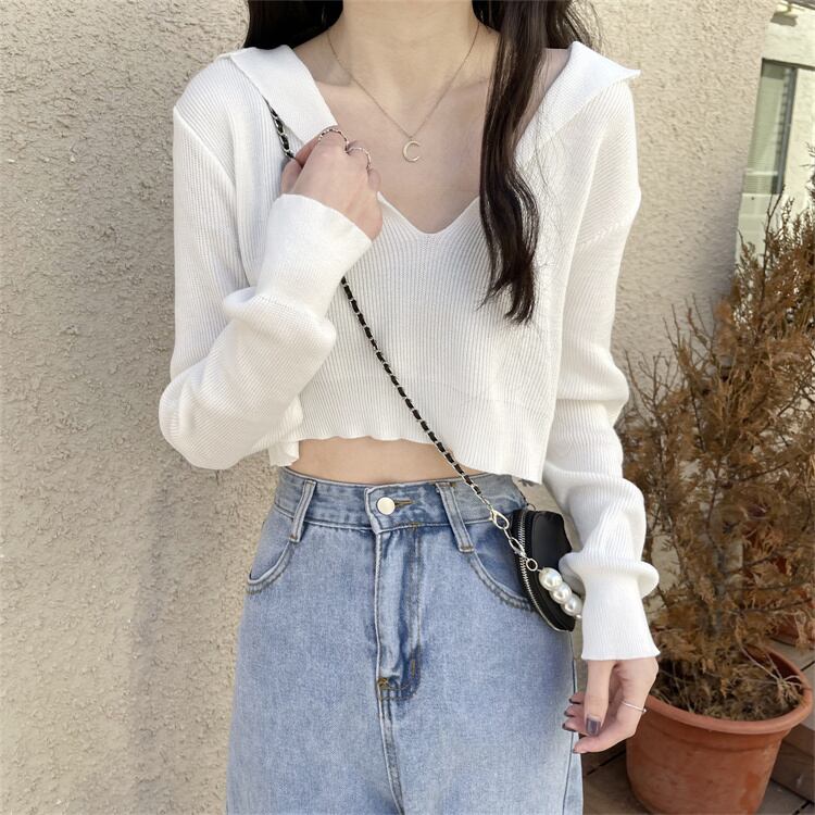 ショート丈 トップス レディース カットソー プルオーバー 長袖 萌袖 Vネック 襟付き セーラーカラー ワイド フェミニン 肌見せ かわいい 大人可愛い シンプル カジュアル おしゃれ こなれ感 ラフ 主役級 存在感 抜け感 ラブリー キュート 都会的 ベーシック ナチュラル 無地 春 夏 10代 20代 ティーン デート お出かけ 女子会 休日 ショッピング カフェ モノトーン 普段使い 着回し モテ トレンド 流行 インスタ映え 定番 S M L XL ホワイト ブラック ブラウン アプリコット