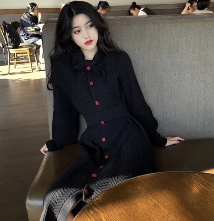 レディース ワンピース ニットワンピース ロング丈 長袖 袖あり 襟なし ボウタイ ストレート Iライン ハイウエスト ウエストマーク かわいい 大人可愛い シンプル カジュアル おしゃれ ラフ キュート 無地 秋 冬 10代 20代 ティーン お嬢さん お姉さん デート お出かけ 旅行 レストラン 公園 女子会 休日 ショッピング 合コン コンパ カフェ 暖かい 防寒 美脚 脚長 普段使い モテ S M 黒 ブラック 大人カラー 秋カラー
