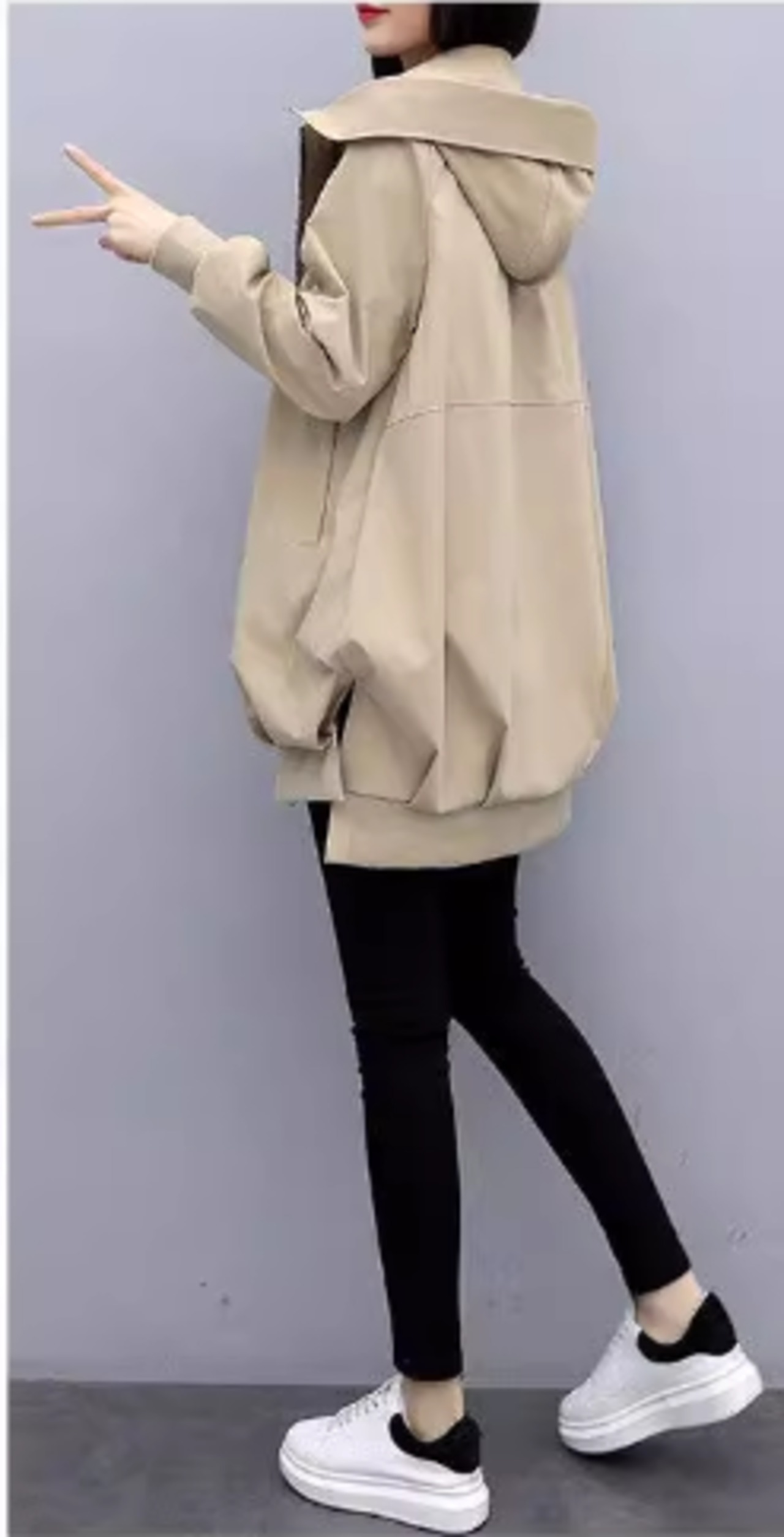 ミディ丈のシンプルなフード付きジャケットです。