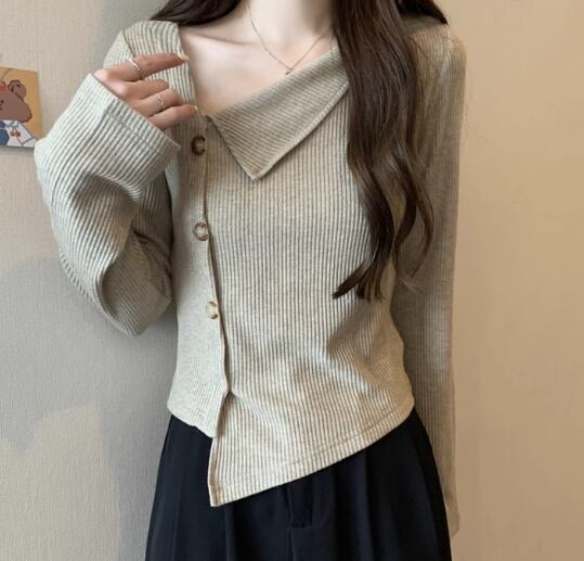 トップス カットソー ミディアム丈 長袖 フレンチスリーブ Vネック 襟付き 角襟 アシンメトリー スリム 細身 フェミニン ボタン 中厚手 ニット 大人可愛い シンプル カジュアル こなれ感 ルーズ キュート 無地 秋 冬 ミーティング オフィスカジュアル 通勤 通学 デート お出かけ 旅行 レストラン 女子会 休日 ショッピング 合コン コンパ カフェ 暖かい 普段使い 着回し モテ トレンド L XL 2XL 3XL 4XL 大きいサイズ ゆったり ゆる 黒 ブラック ベージュ ピンク