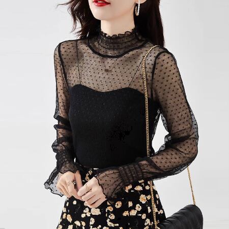 レディース トップス プルオーバー ミディアム丈 長袖 フレアスリーブ ハイネック タートルネック 襟なし ノーカラー スリム 細身 レース チュール ふわふわ 透け感 シースルー 薄手 シアー 大人可愛い シンプル カジュアル おしゃれ ガーリー キュート ドット柄 水玉 総柄 オフィスカジュアル オフィス 通勤 学校 通学 デート お出かけ レストラン 女子会 休日 ショッピング 発表会 コンサート ライブ 合コン 重ね着 レイヤード S M L XL 白 ホワイト アプリコット 大人カラー