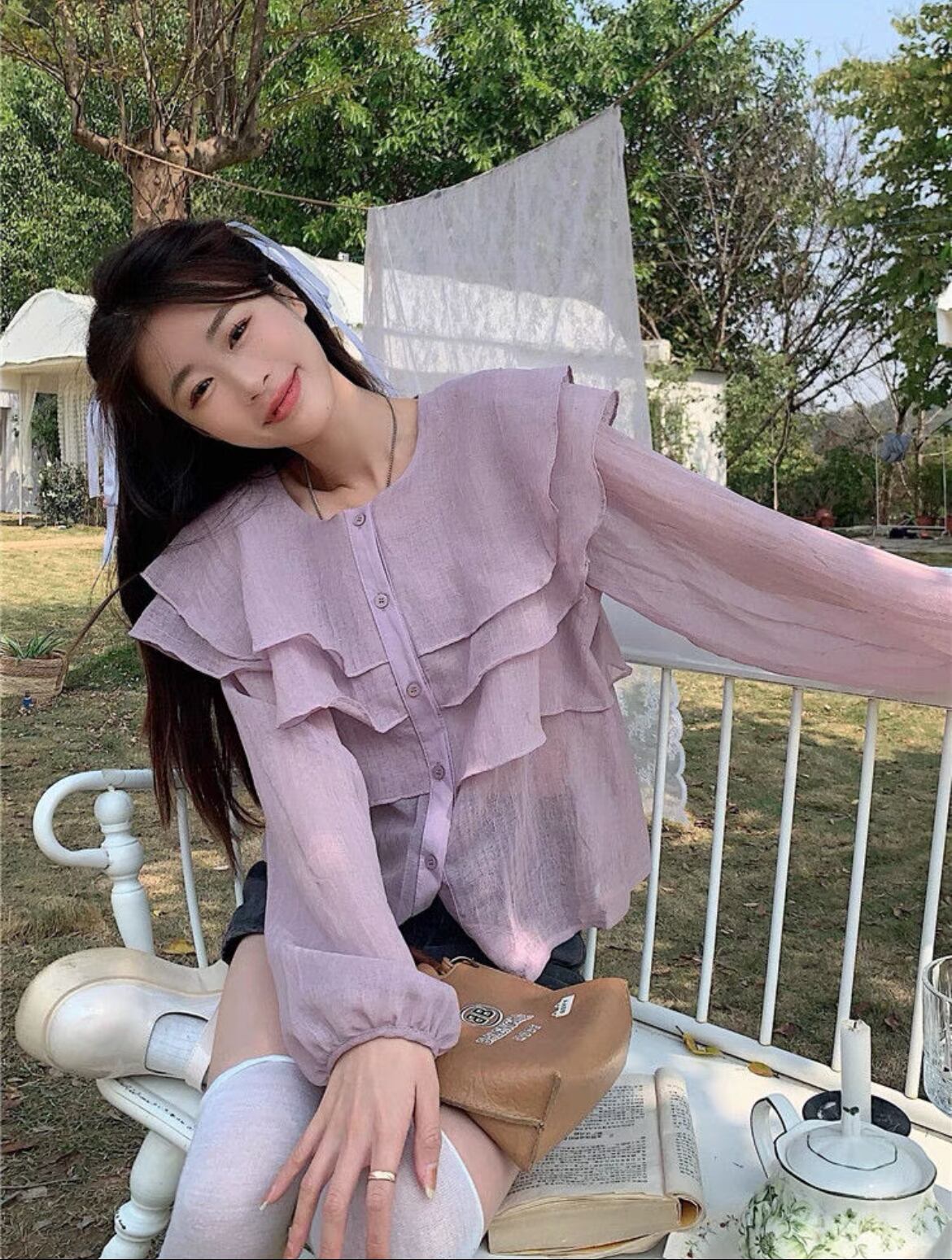 レディース トップス ブラウス 長袖 クルーネック 襟なし ワイド フェミニン フリル 薄手 かわいい 大人可愛い きれいめ シンプル カジュアル 上品 おしゃれ こなれ感 ラフ ガーリー 個性的 モード系 エレガント 主役級 存在感 都会的 ベーシック ナチュラル 無地 春 夏 10代 20代 ティーン デート お出かけ 女子会 休日 ショッピング カフェ オルチャン コーデ 着回し モテ 清楚 トレンド 流行 インスタ映え 定番 S M L XL ゆったり カラバリ ホワイト 大人カラー パープル