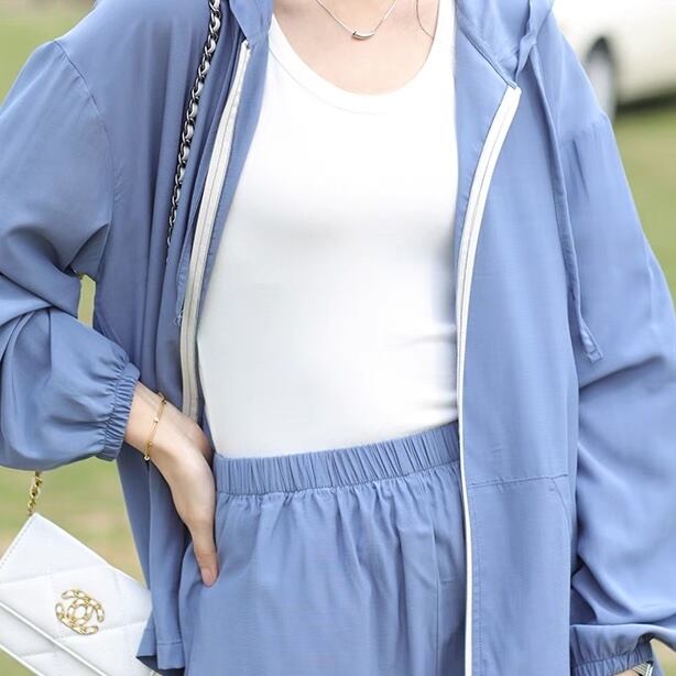 前開きパーカーとショートパンツの組み合わせがビーチやジム、リゾートシーンにもぴったり。