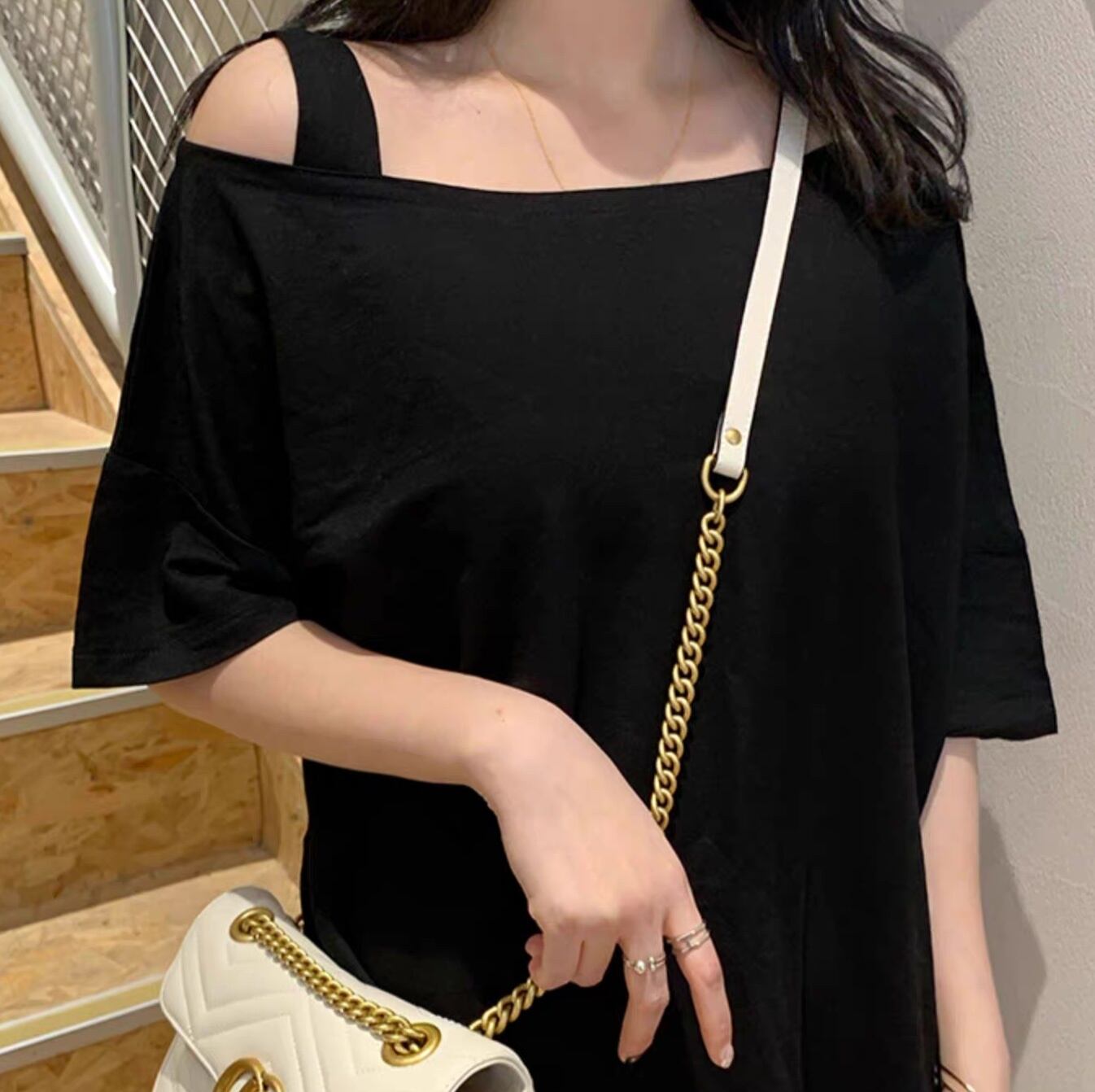 レディース ワンピース 膝丈 アシンメトリー 半袖 ラウンドネック オフショルダー ワンショルダー フレア セミフレア Aライン フェミニン ストリート かわいい 大人可愛い シンプル カジュアル おしゃれ こなれ感 ガーリー ルーズ 個性的 クール 抜け感 ラブリー キュート ベーシック アクティブ ロマンティック ナチュラル ファッショナブル 無地 夏 休日 バカンス ショッピング フェス モノトーン 重ね着 普段使い 着回し トレンド 流行 インスタ映え ゆったり ゆる フリーサイズ 黒 ブラック