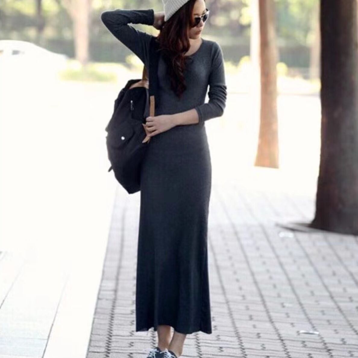 レディース ワンピース マキシ 長袖 ラウンドネック タイト スリム 細身 フェミニン ストリート かわいい 大人可愛い きれいめ シンプル カジュアル 上品 おしゃれ かっこいい レトロ こなれ感 ルーズ クール 抜け感 ラフ ベーシック ロマンティック ナチュラル ファッショナブル 無地 春 お出かけ リゾート 旅行 ビーチ 休日 バカンス 韓国 オルチャン 楽ちん 体型カバー 普段使い 着回し トレンド 流行 定番 S M L XL 2XL 3XL 灰色 黒 ブラック ライトグレー ダークグレー