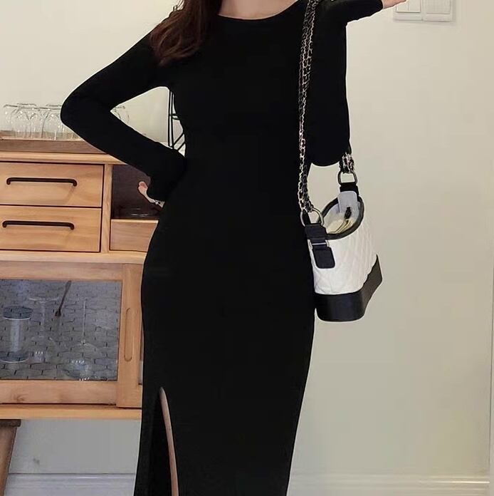 レディース ワンピース 膝丈 長袖 ラウンドネック タイト スリム 細身 スマート フェミニン スリット サイドスリット かわいい 大人可愛い きれいめ シンプル 上品 おしゃれ かっこいい こなれ感 ガーリー エレガント 存在感 抜け感 ラブリー キュート ベーシック ロマンティック ナチュラル ファッショナブル 無地 デート お出かけ イベント 休日 カフェ モノトーン 美脚 脚長 普段使い 着回し トレンド インスタ映え 定番 XS S M L XL 2XL 小さいサイズ 大きいサイズ 黒 ブラック