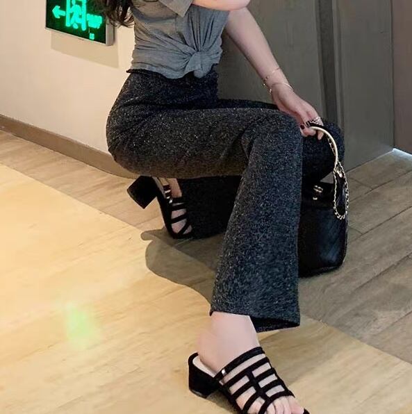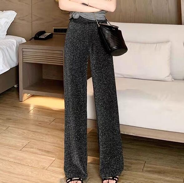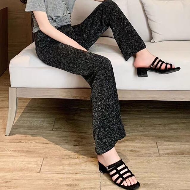 ハイウエストのラメ入りボトムスが脚長効果を引き出しシンプルながらも華やかに。