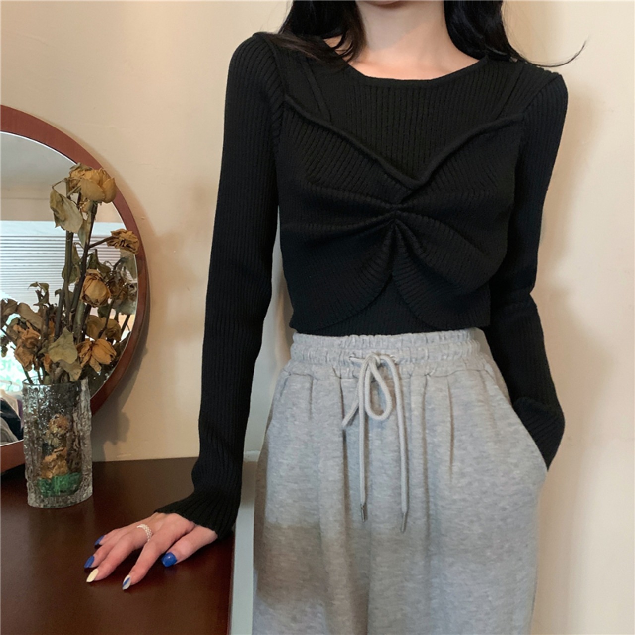 シンプルなラウンドネックに、さりげないリボンがアクセントの秋冬にぴったりな一枚。
